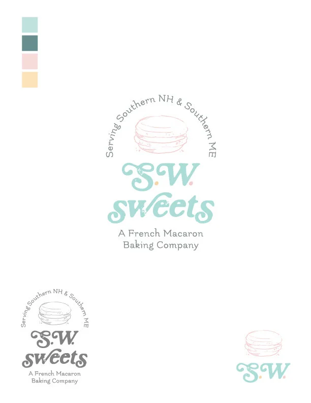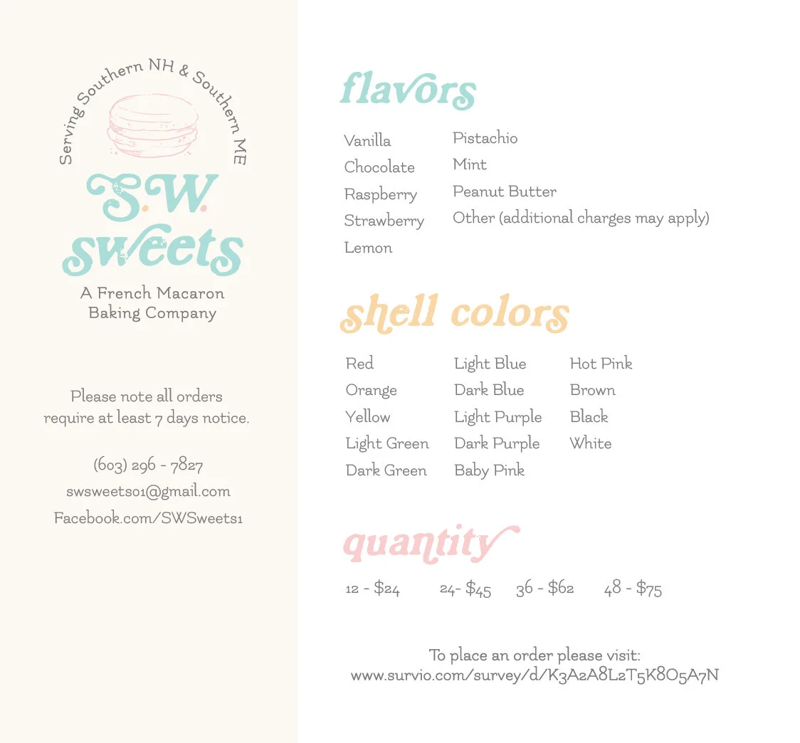 Branding and business cards for a small bakery that specializes in macarons! It was important for this bakery to feel light, fun, and whimsical, while incorporating pastel colors (the owners’s favorite!). Featured below are her business cards and digital menu to post for social.